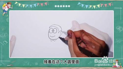 接着在这个大圆里面从右边到耳朵画一根线,并在脑袋下画一个三角形和两个长方形,一大一小。