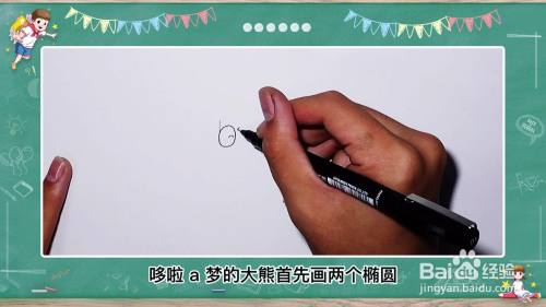 首先,画两个椭圆,在椭圆里面画一根短短的线。然后,把两个圆用一个大圆画,左边突出,并在里面画一横。