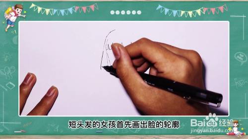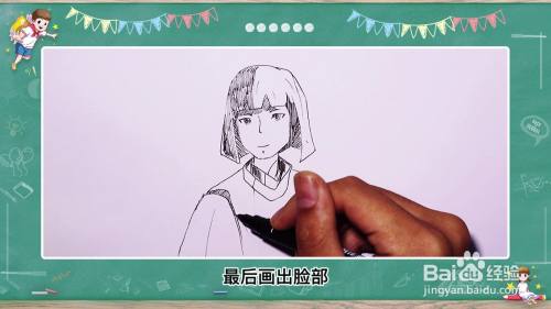 首先,画出脸的轮廓,画出刘海和披着的头发。