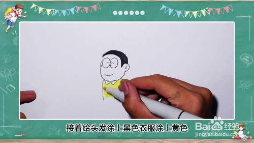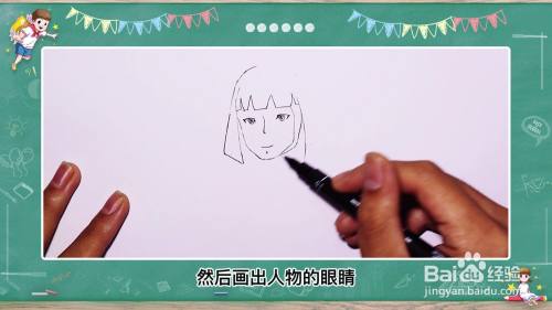 然后,画出人物的眼睛、鼻子和嘴巴。接着画出脖子,并围着脖子画出衣领,再画出人物的衣服。