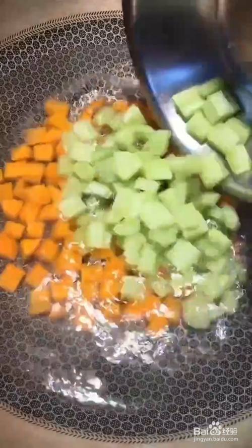 锅中烧水,将切好的胡萝卜丁和芹菜丁放进去,烫熟之后捞出。
