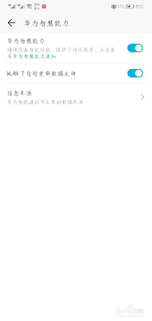 打开华为智慧能力页面,可以看到三个选择开关,第一个是华为智慧能力,接下来是自动更新数据文件。将其开关打开。