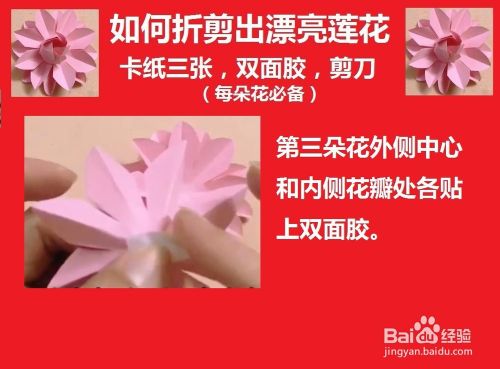 用三张粉红色的彩纸可通过折纸,剪纸,粘贴,合拢形成一朵漂亮的莲花。