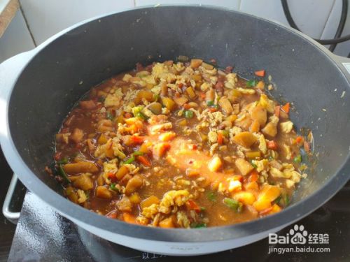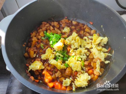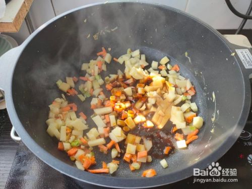 倒入土豆丁、胡萝卜丁,淋上欣和原酿酱油,大火炒匀。