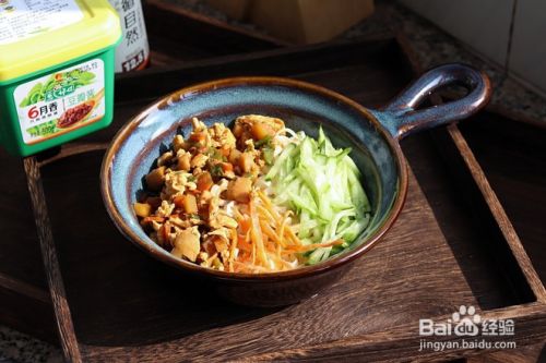 准备一个大碗,装入半碗面条,铺上炒好的炸酱、黄瓜丝、胡萝卜,一碗家常好吃的炸酱面就完成了