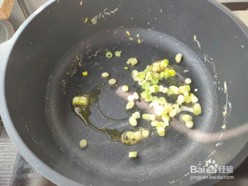 接着锅内淋上少许植物油,倒入葱花炒香。
