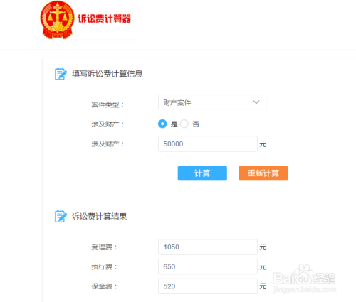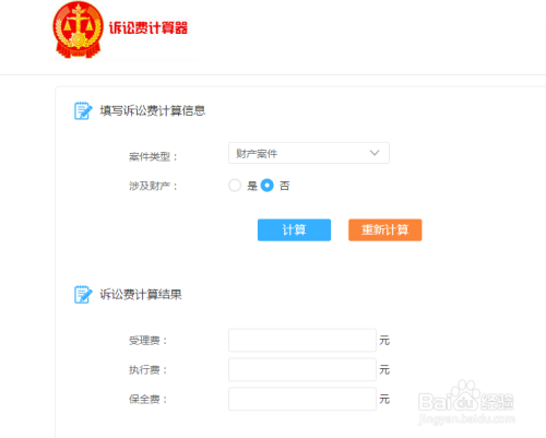 点入诉讼费计算器的链接,涉及财产的案件点击“是”的选项