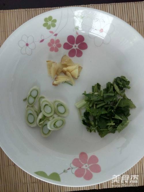 2葱切粒,姜切成片,香菜洗净切段。