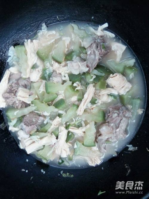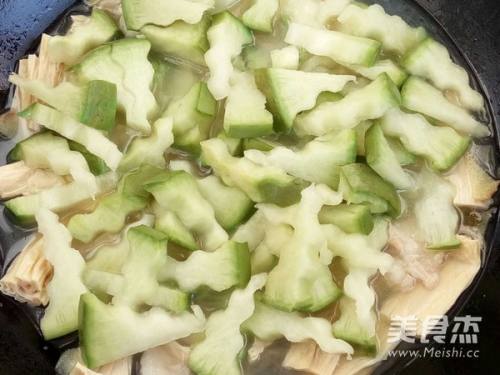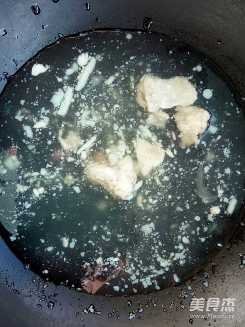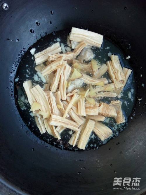 5将姜片和腐竹加入汤里,开火。