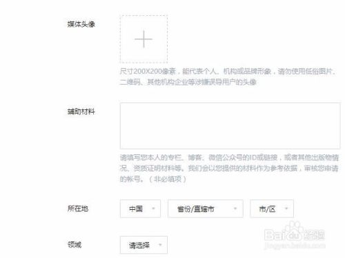上传头像,填写辅助材料,你的博客或者微信公众平台主页链接都可以,选择领域,但要与你的媒体定位一致哟,不然有可能过不了试运营。
