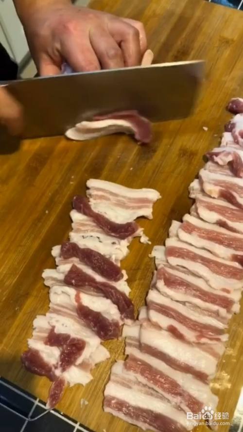 两斤五花肉切片备用,水下锅。倒入20g酒。焯水捞出备用。