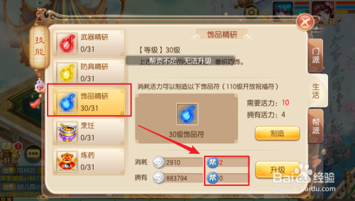 进入“生活”选项操作界面以后,将制作附魔符的技能进行升级。