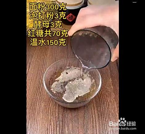 第1步,300克面粉中加入三克泡打粉,三克酵母,加10克红糖,150克温水,把它们化开,加60克红糖,全部化开,加入面粉中,揉成光滑的面团,密封醒发。