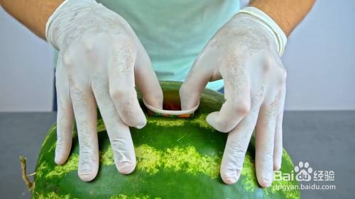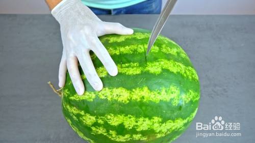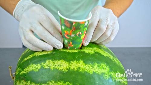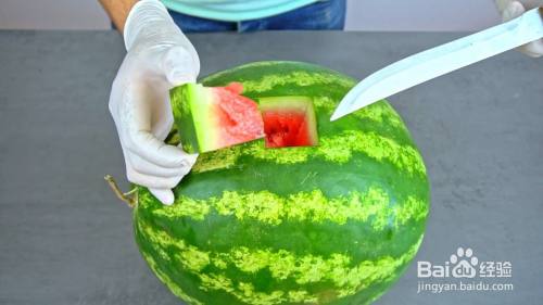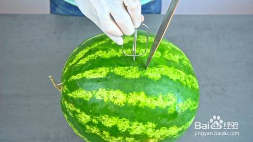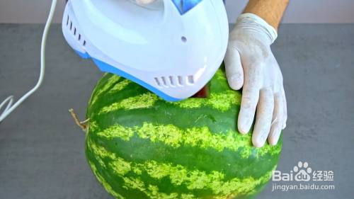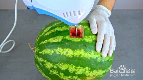 在西瓜上切下一个比搅拌器头子稍微大点的方形。