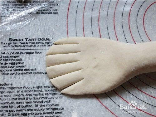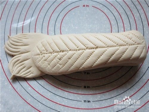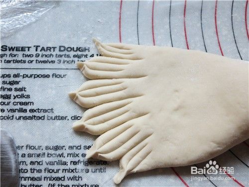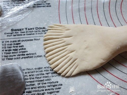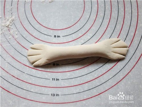 55克面团滚圆后搓成条,两端稍按,分别切3刀切出后脚趾