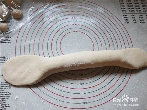 取一块540克重的面团作为小老虎的身体,滚圆后搓成条,两端按扁