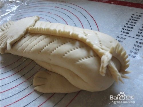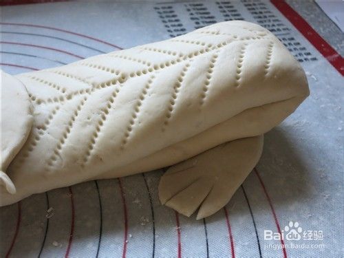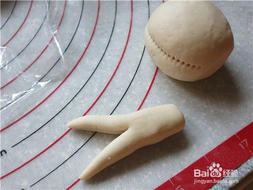 取一块85克重的面团搓圆,用小梳子在中部向内压出嘴形,取一块15克重的小面团做成长锥形,在尖的一端用剪刀剪开做鼻子