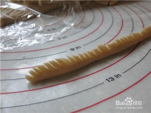取一块10克的小面团,搓成长条,捏成三角条形,顶部用剪刀剪碎边