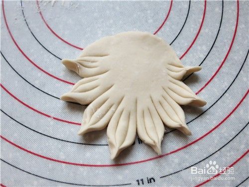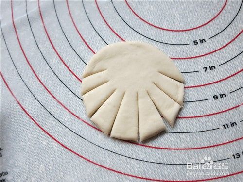 取一块35克的面团搓圆后按扁擀成片,在一侧切8刀
