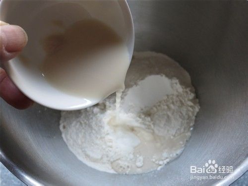 面粉放入厨师机搅拌桶中,加入酵母水,放入白糖