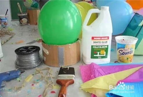 准备材料:气球、皱纹纸、白乳胶、刷子、绳子、硬纸板、剪刀、蜡烛、蜡烛托。按照1:4的比例调和乳胶和水。