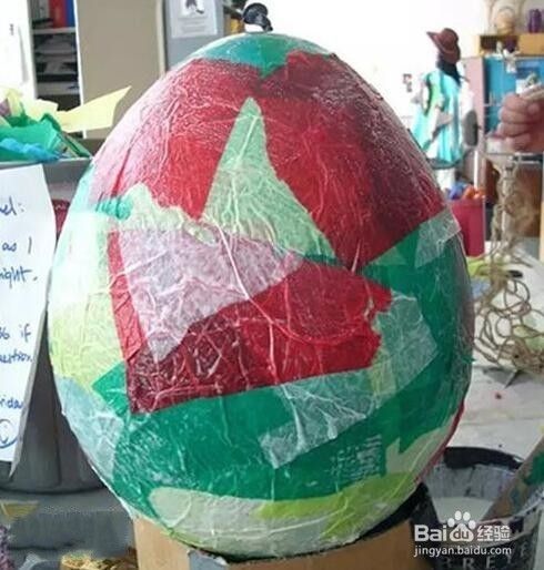 气球吹起来后,放置到纸筒上。把皱纹纸裁剪后用白乳胶贴到气球上。
