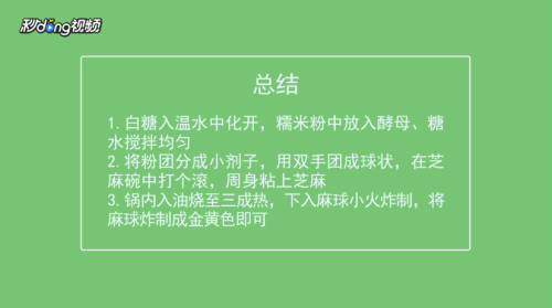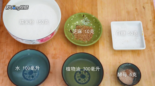 食材:100ML水、300ML植物油、5克酵母、50克白糖、10克芝麻、150糯米粉。