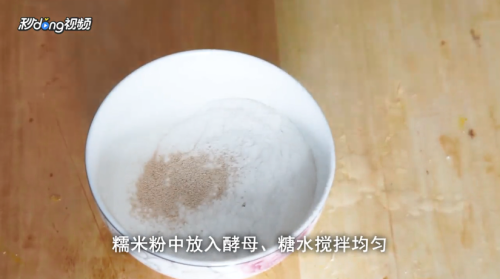 白糖于温水中化开,糯米粉中放入酵母、糖水搅拌均匀。
