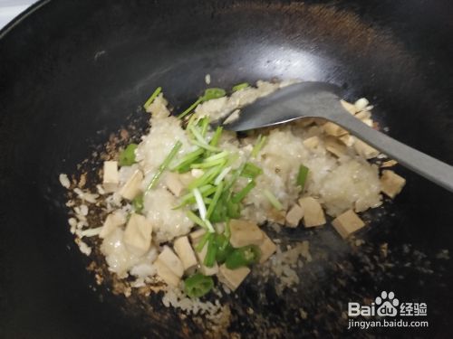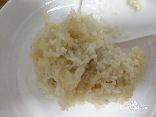 加入在冰箱放置了一个晚上的糯米饭,放入锅中翻炒,适量添加清水炒匀不需要添加任何佐料了,一直到糯米饭熟透为止