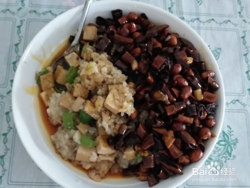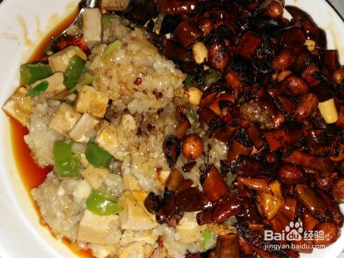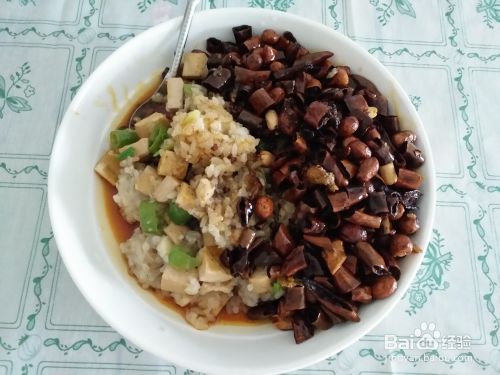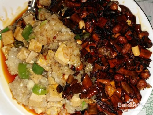 盛入碟子中,此时香辣花生米就出场了,还记得小编之前教大家做的香辣花生米吗?将一小碗香辣花生米从冰箱取出,放入锅内加热,后直接倒入盘子边,不要完全覆盖糯米饭,留出一半就可以,此时豆干花生糯米饭就做好了,大家赶紧看看冰箱是不是还剩下这些材料,也动手将其做成美味吧!