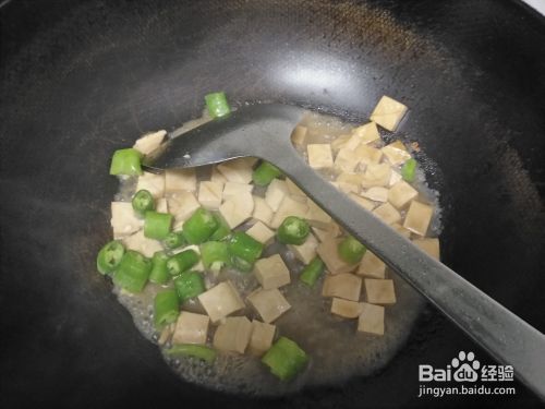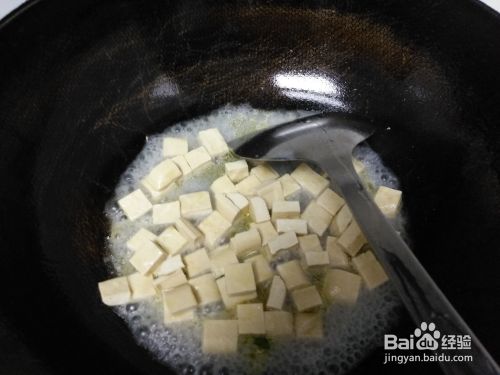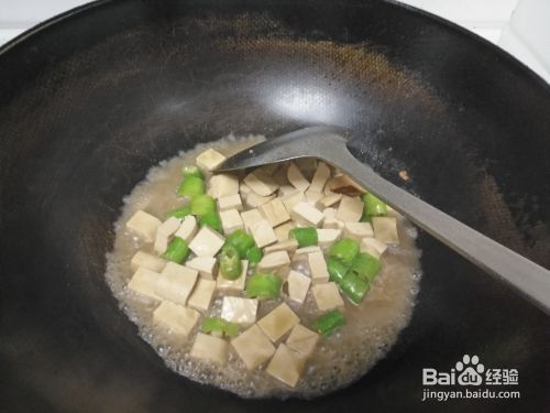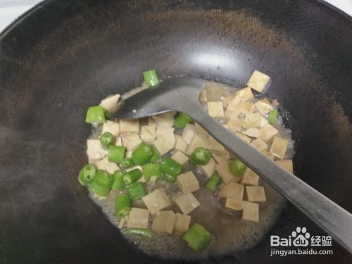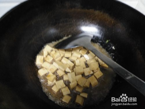 将锅烧热,加入适量食用油,即刻放入切好的豆干丁,加入少许生抽,翻炒均匀,添少量清水,继续翻炒至清水即将烧干