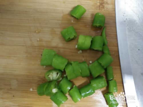 此时加入切好的线椒圈,翻炒均匀后添适量清水继续翻炒,直至八九分熟,加入适量食盐和切好的大蒜子翻炒均匀
