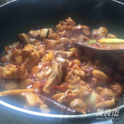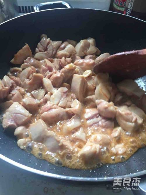 2锅里倒入油 油凉的时候就放糖 等糖化了倒入鸡块进行翻炒