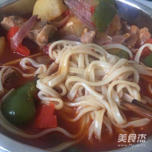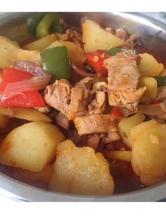 6加盐。加入辣椒、土豆和洋葱.再炖15—20分钟 。 然后就大功告成啦。 本人喜欢吃煮烂的土地,如果喜欢吃脆的就时间短点咯。