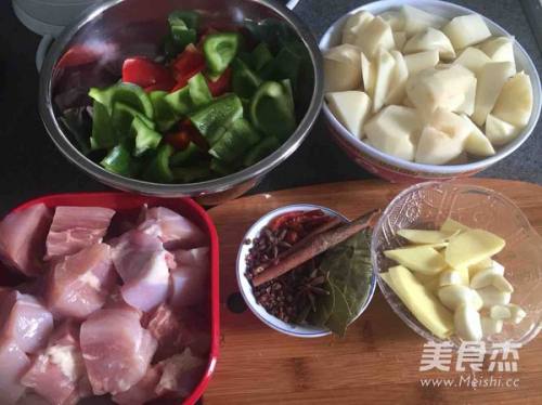 1将鸡腿切好 倒入料酒去腥味 洋葱切成条 青椒和大红辣椒切好 土豆也切好 根据自己喜好切大小 葱姜蒜大料都准备好。如图。