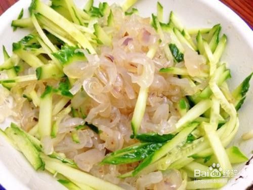 将盐、酱油、醋、味精、香油同置一碗中,兑成调味色清汁。将黄瓜丝、海蜇丝分层码入盘中,上撒香菜段姜丝,浇上调味色清汁,拌匀即可食用。