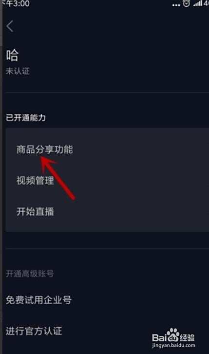 找到商品分享功能,然后开通它(需要发布10个视频及实名认证)。