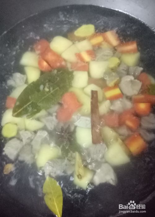 牛肉压好后,连汤一起倒入汤锅里,加入胡萝卜块和土豆块,烧开后改小火再炖20分钟。