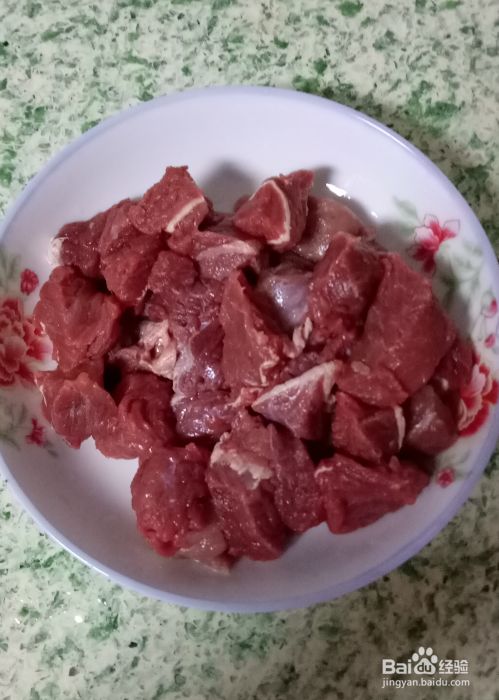 牛肉先用清水泡十分钟泡出血水后,洗净后切成四厘米大小的正方形块。