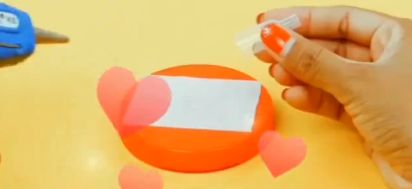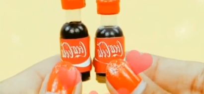 在胶头滴管的头部粘上红色的贴纸,用海绵纸剪出一个盖子的形状,涂上红色指甲油,用热熔胶粘在胶头滴管的头部,这样芭比的小可乐就做好了,你也来试试吧