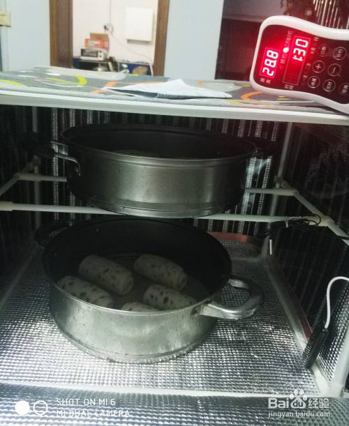 把剩下的剂子全部这样包好,放到蒸笼里摆好,然后放温暖的地方发酵,天冷的话可以用发酵箱,没有发酵箱可以把蒸锅里放30度左右的温水,把蒸笼放上发酵,发到红豆卷明显大一圈就行了