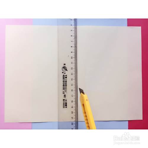 将A4纸对折,尺子从中间压住,手工刀裁开。