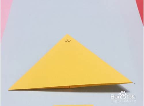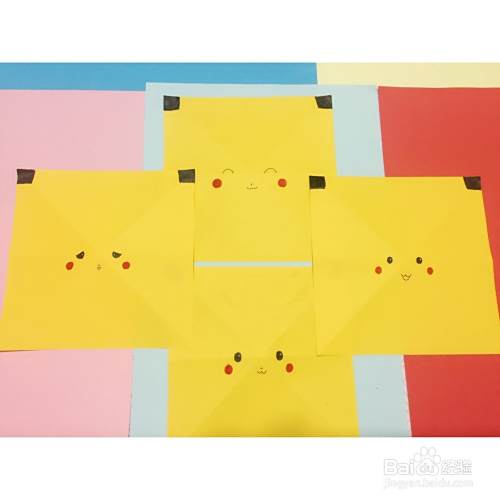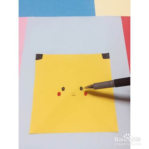 黑色水性笔在纸的凸面上依次画出皮卡丘的眼睛鼻子嘴巴耳朵,红色彩色笔涂上两个红脸蛋。注意眼睛和红脸蛋需画在两边的三角形区域内,眼睛之间的距离要适当。鼻子和嘴巴画在下面的三角形区域内。