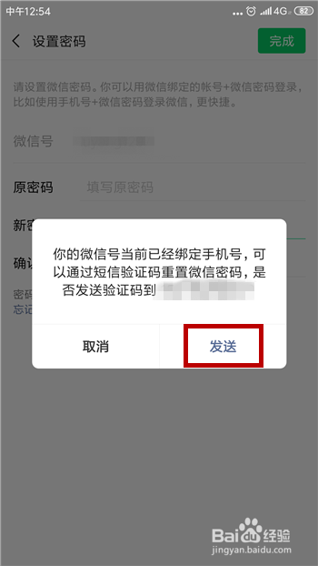 然后系统会提示我们已经绑定的手机号码,我们点击【发送】进行验证。