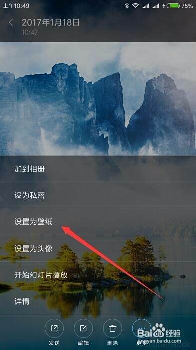 在弹出的菜单中选择“设置为壁纸”菜单项,这时就可以把漂亮的锁屏画报设置为壁纸了。