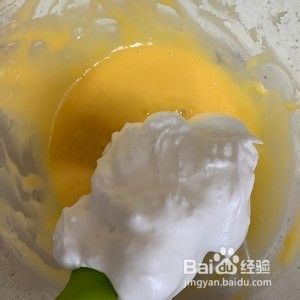 混合蛋白霜和蛋黄糊,先取1/3蛋白霜与蛋黄糊混合,用切拌和翻拌的手法,混合至没有的蛋白霜为止;