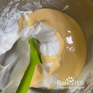 快速搅拌,避免蛋白消泡;将刚才混合好的蛋糊倒入蛋白盆,用同样的手法翻拌;