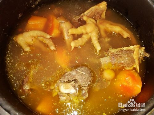 1、把药材清洗干净,鸡脚斩成一段段,牛骨灼过水,木瓜切成厚块备用。