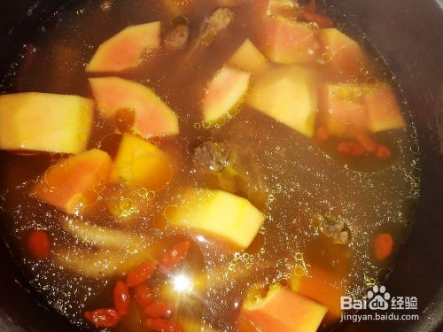 2、除了木瓜,剩下的食材放到锅里煲炖2个小时,煲到差不多够时间,打开放木瓜进去再继续煲够时间即可。