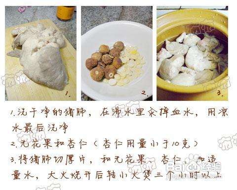 将猪肺洗净,切成块;生姜切成片。炒锅中放食油少许,烧热后把猪肺放入翻炒,加入杏仁、无花果、生姜、食盐、酱油等,置火上用小火煨炖,至熟烂后即可服食。